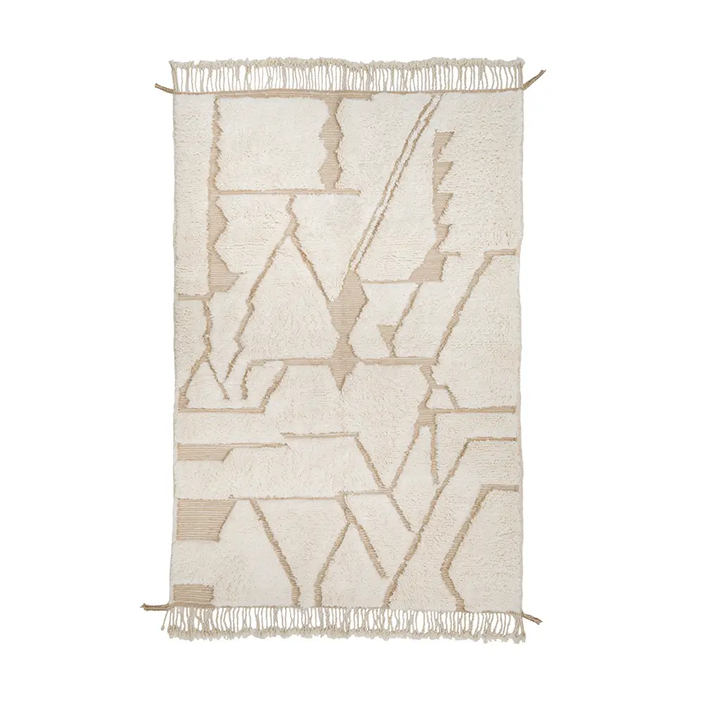 A rectangular cream-colored rug with a subtle grid pattern and fringe on the shorter edges.