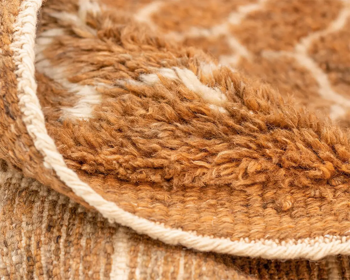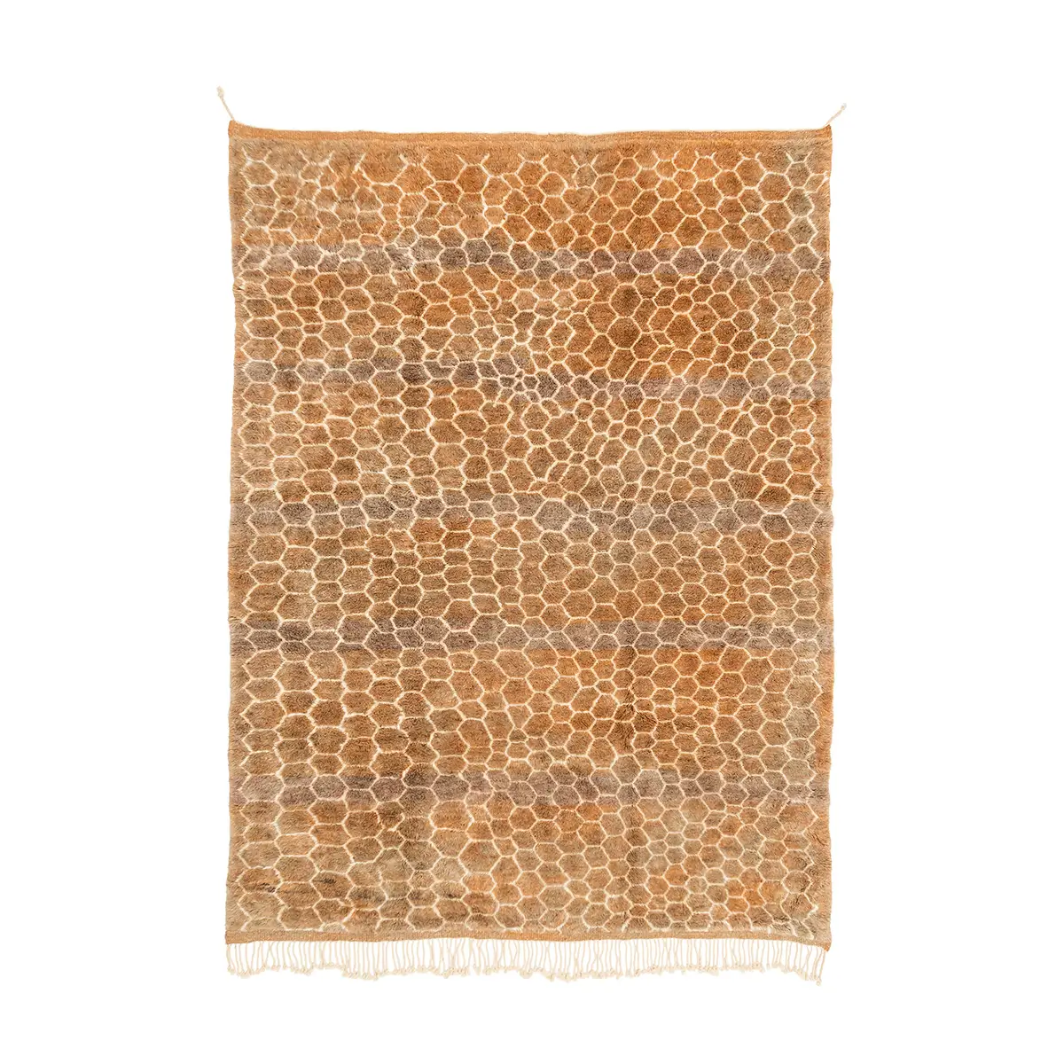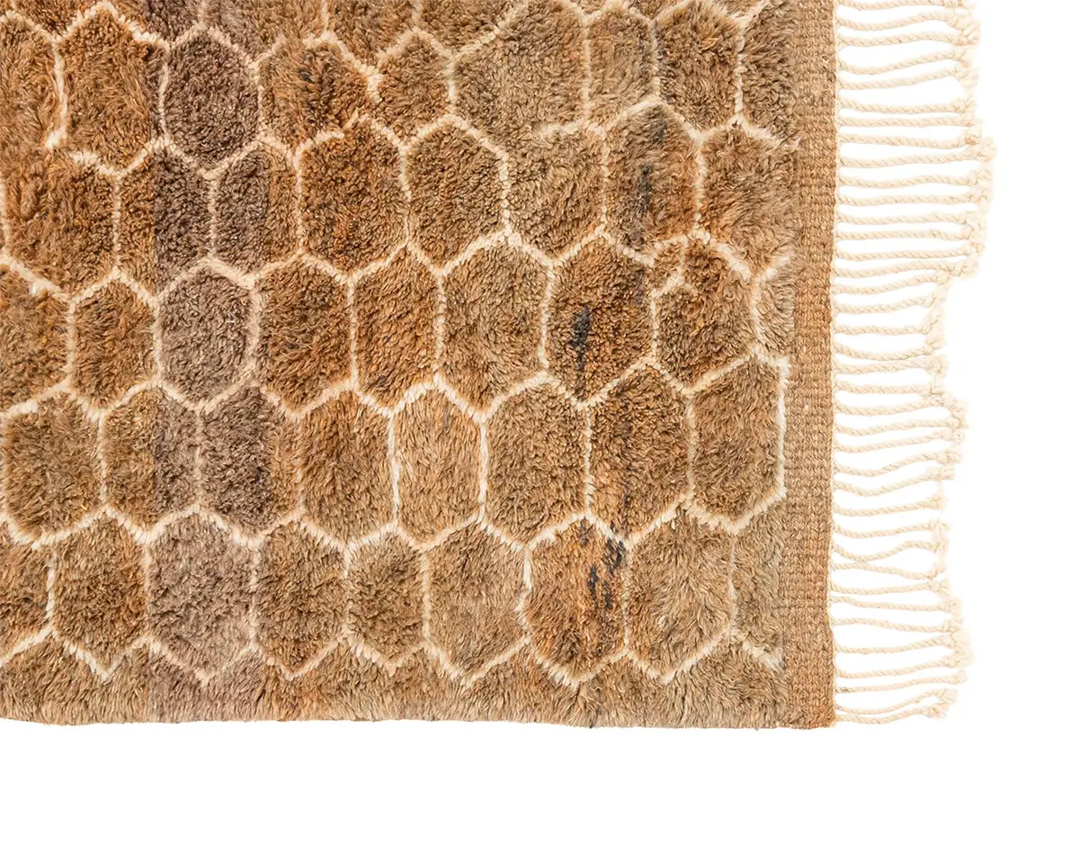 Exquisite hand-knotted rug with a honeycomb-inspired pattern in a rich spectrum of Honey Ginger and Deep Taupe, offering a plush texture and sophisticated visual appeal for any interior space.