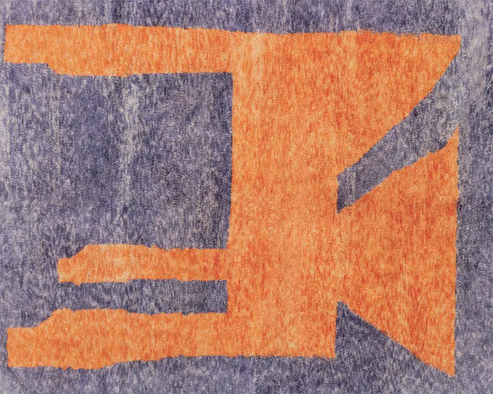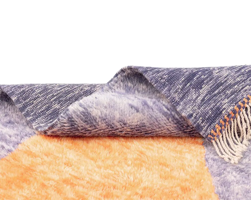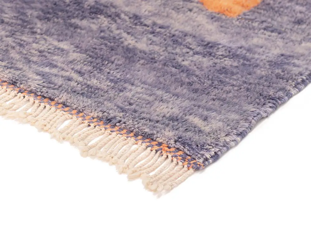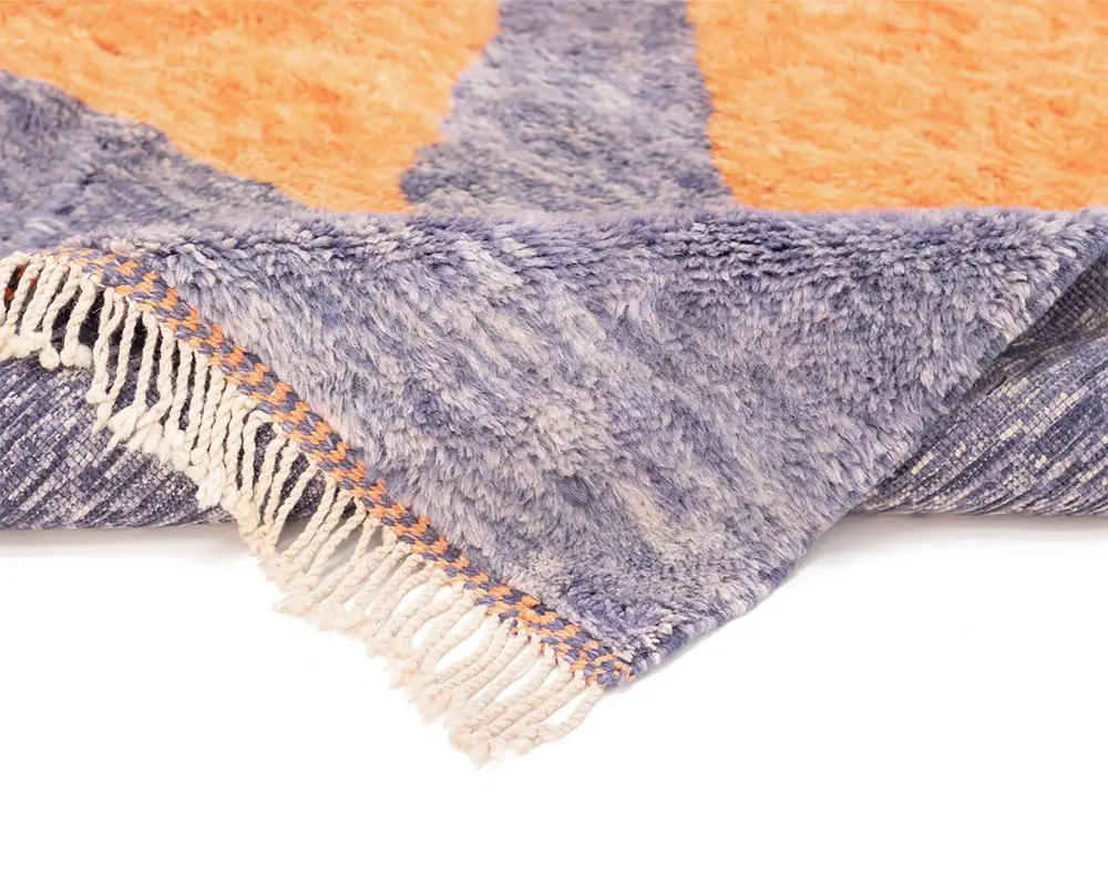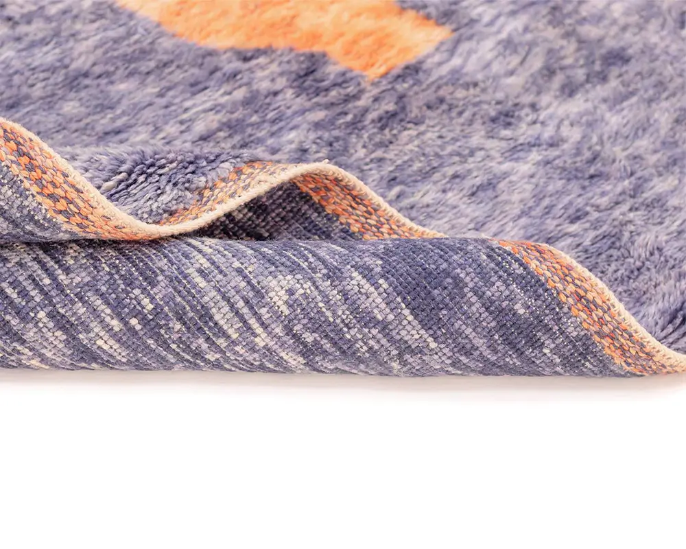 Striking hand-knotted rug with an abstract, oversized geometric pattern in Vivid Tangerine and Indigo, offering a modern, artistic touch to any floor space.