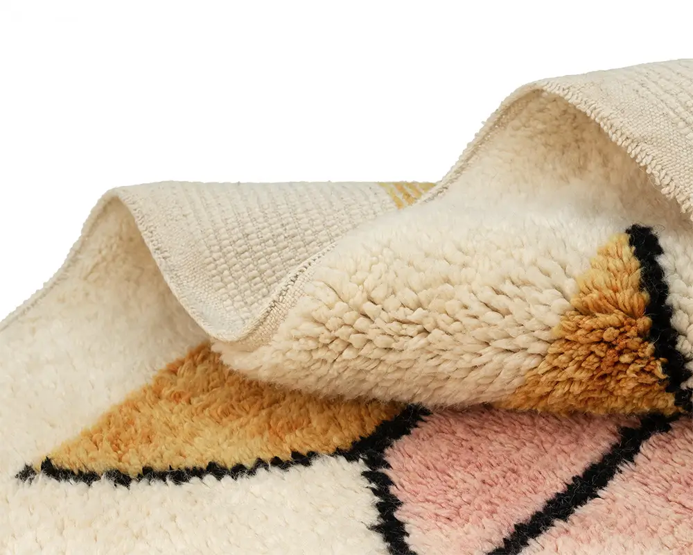 A folded, multicolored rug with fringe, displaying abstract patterns in green, yellow, red, and beige.