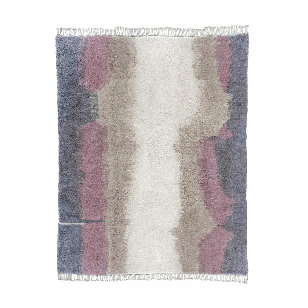 This hand-knotted luxury rug features abstract organic shapes in yellow, green, and red. The central design showcases intersecting forms with distinct color sections, all complemented by fringed edges on top and bottom for an exquisite finish.