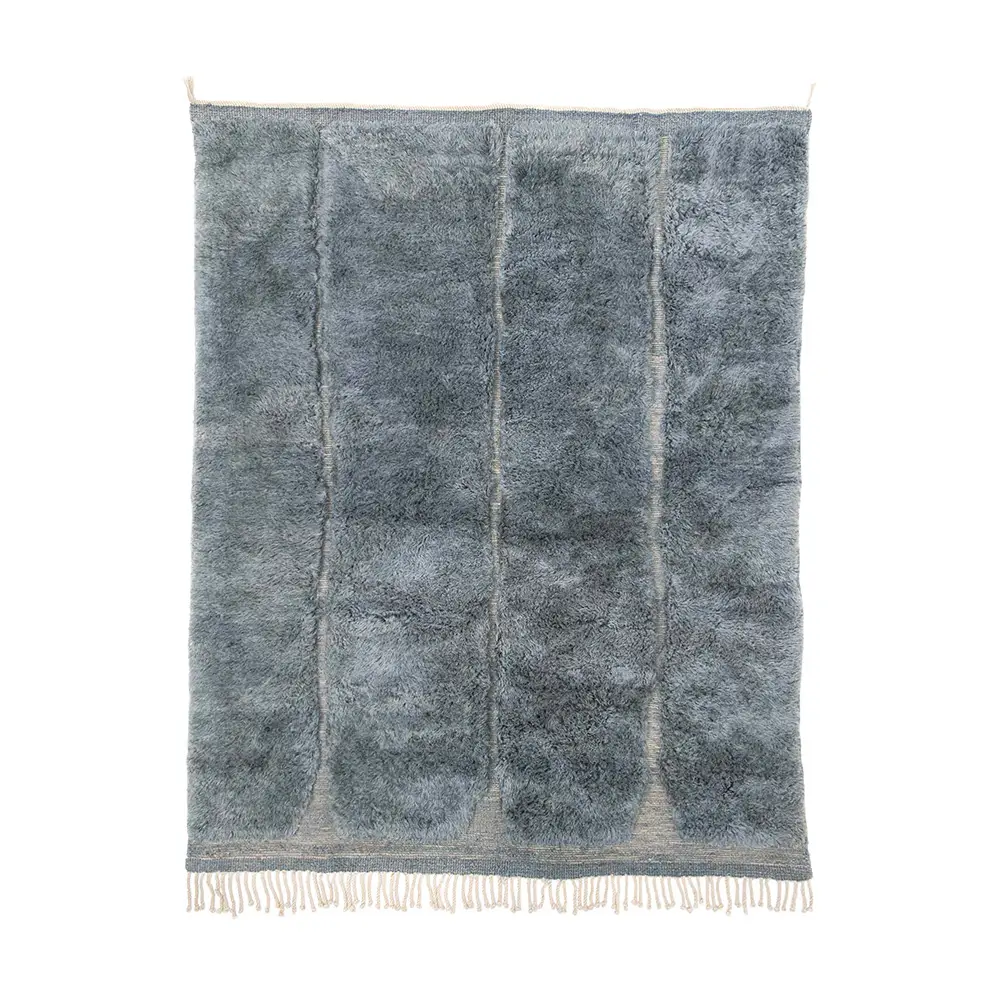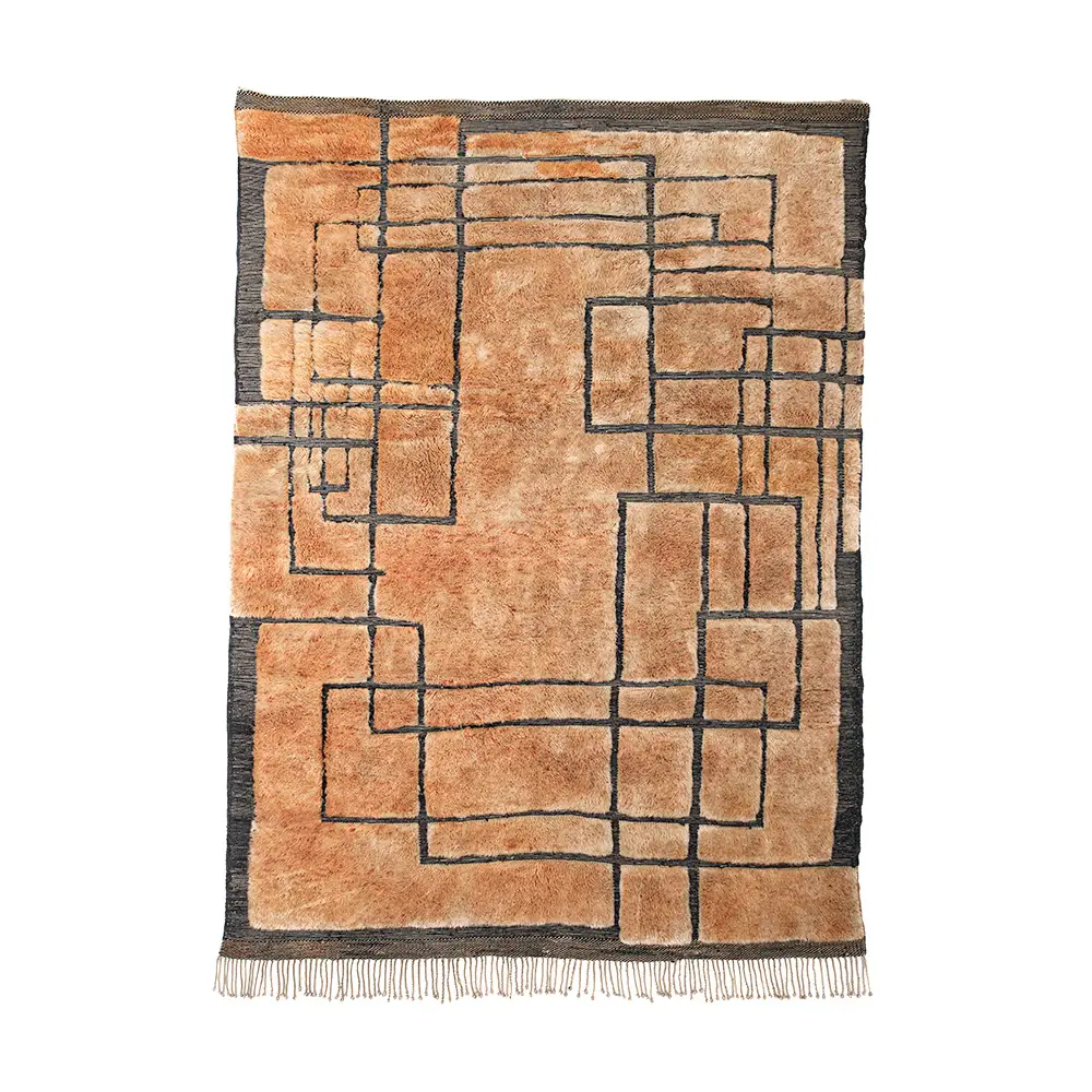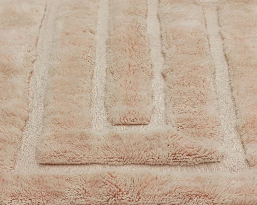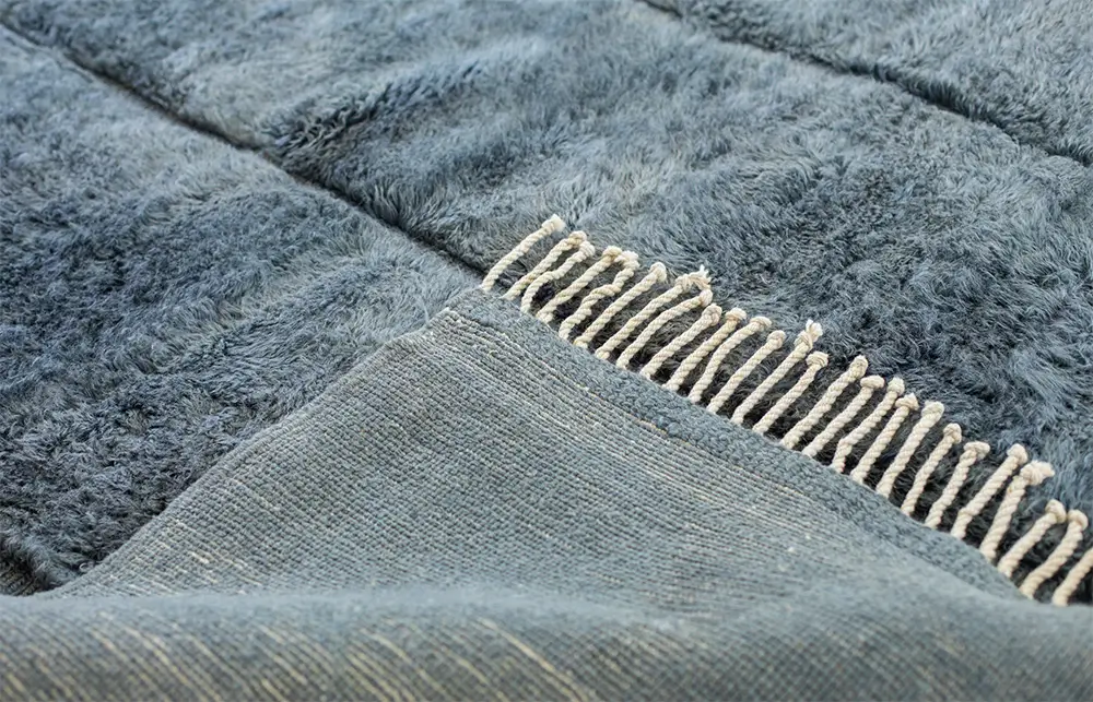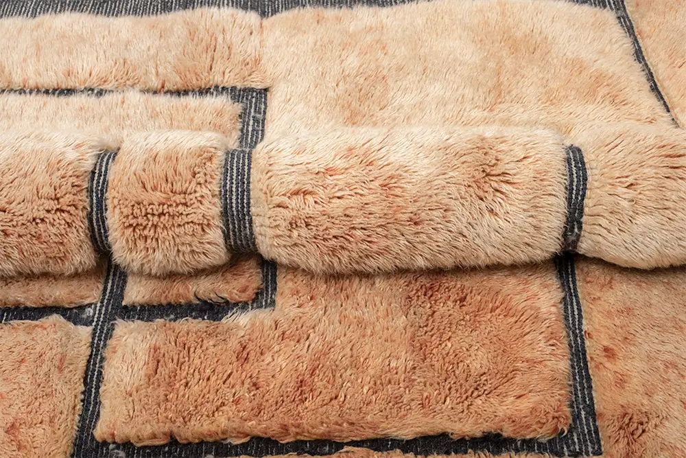 A folded beige luxury rug with a textured underside, featuring layered seams and fringed edges.