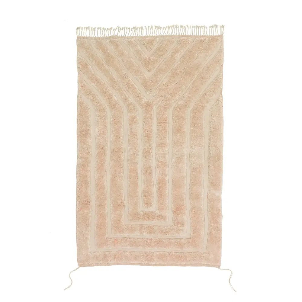 A rectangular, cream-colored rug showcases a striking geometric pattern with fringed edges, adding elegance and style to any room. Perfect for those seeking a touch of sophistication.