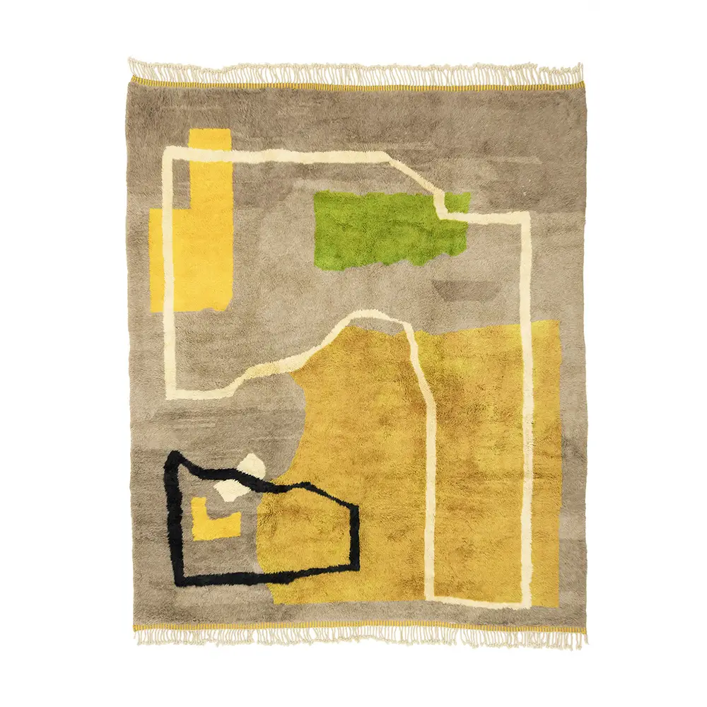 Moroccan rug with horizontal stripes in gradient shades of yellow to brown, interspersed with thin white lines.