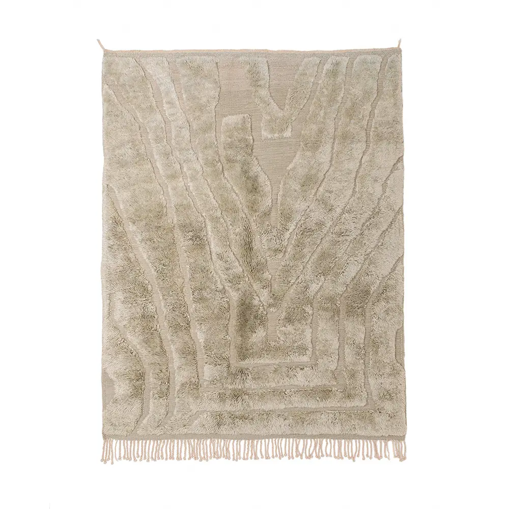 A beige woven throw rug with fringed edges is laid over a thick, plush, cream-colored textured rug.