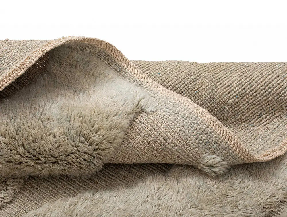 A close-up of a cream-colored, textured rug showing both the soft, plush top surface and the woven underside.