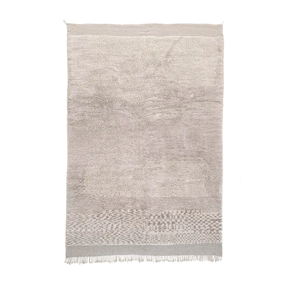 A close-up of a cream-colored, textured area rug with decorative fringe and a folded corner showing the woven underside.