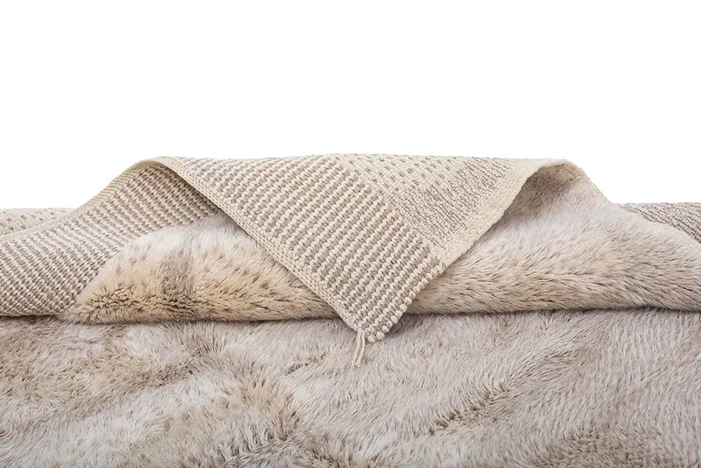 Close-up view of a soft, cream-colored, fluffy rug with a plush texture.
