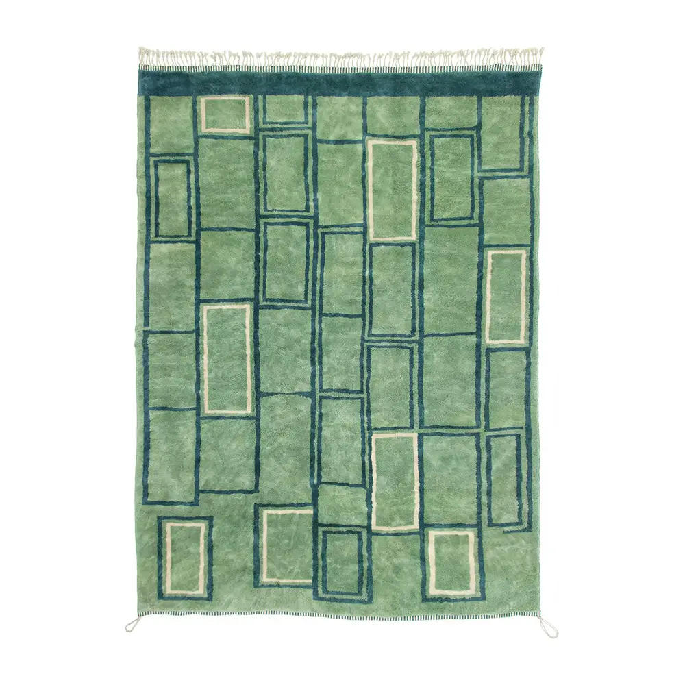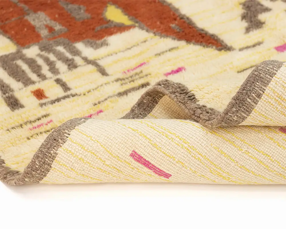A close-up of an artisanal, hand-knotted cream-colored rug with thick black geometric line patterns, partially folded at one corner.