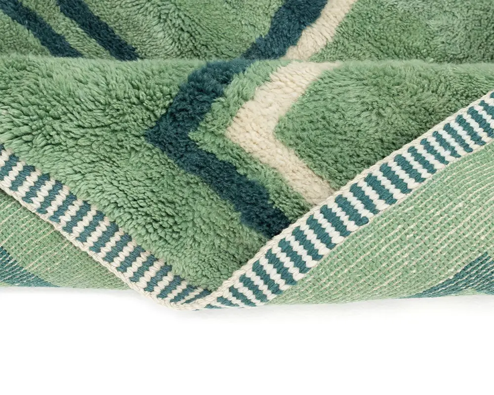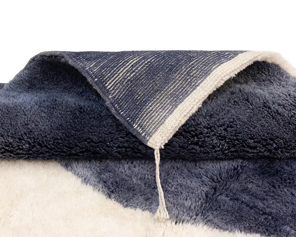 A close-up of a beige and light brown hand-knotted area rug, highlighting the soft, textured top and the woven underside with folded corners.