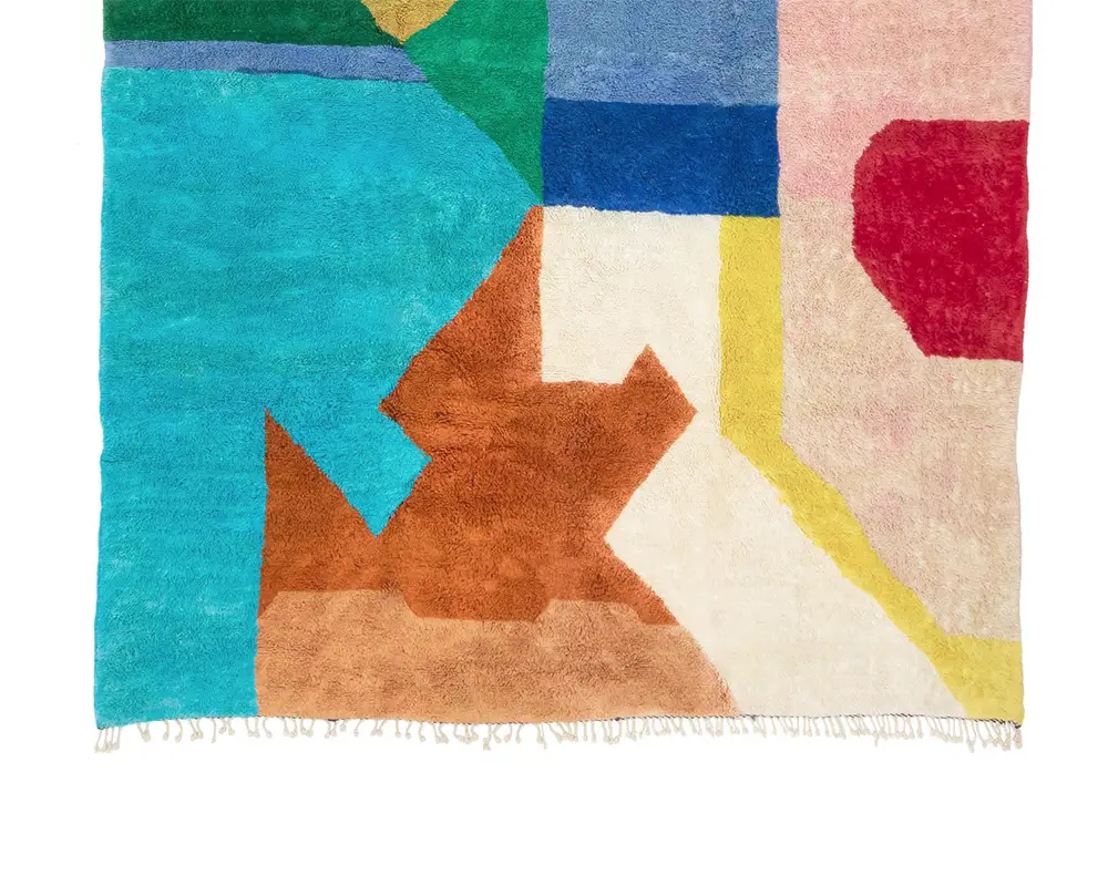Rectangular rug with abstract design in yellow, orange, pink, and cream colors. Features fringed edges at the top.