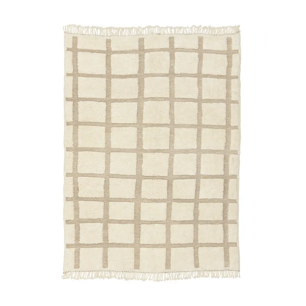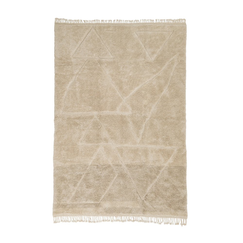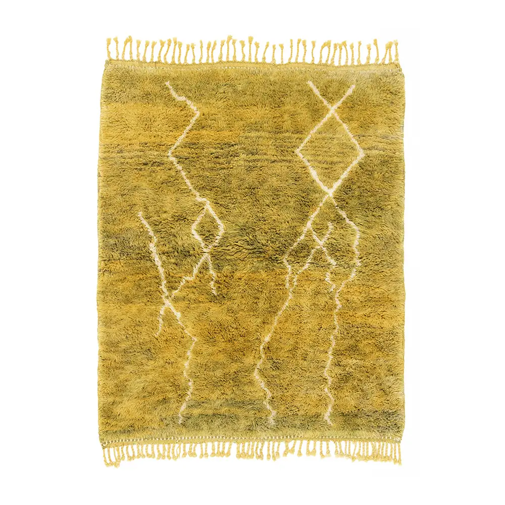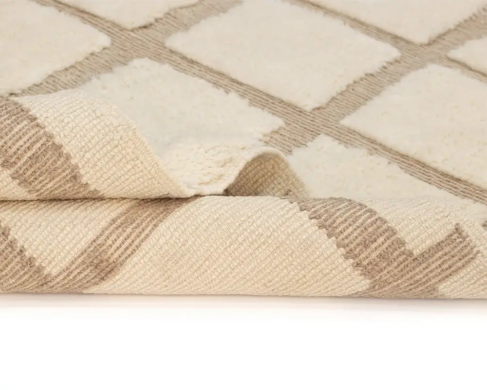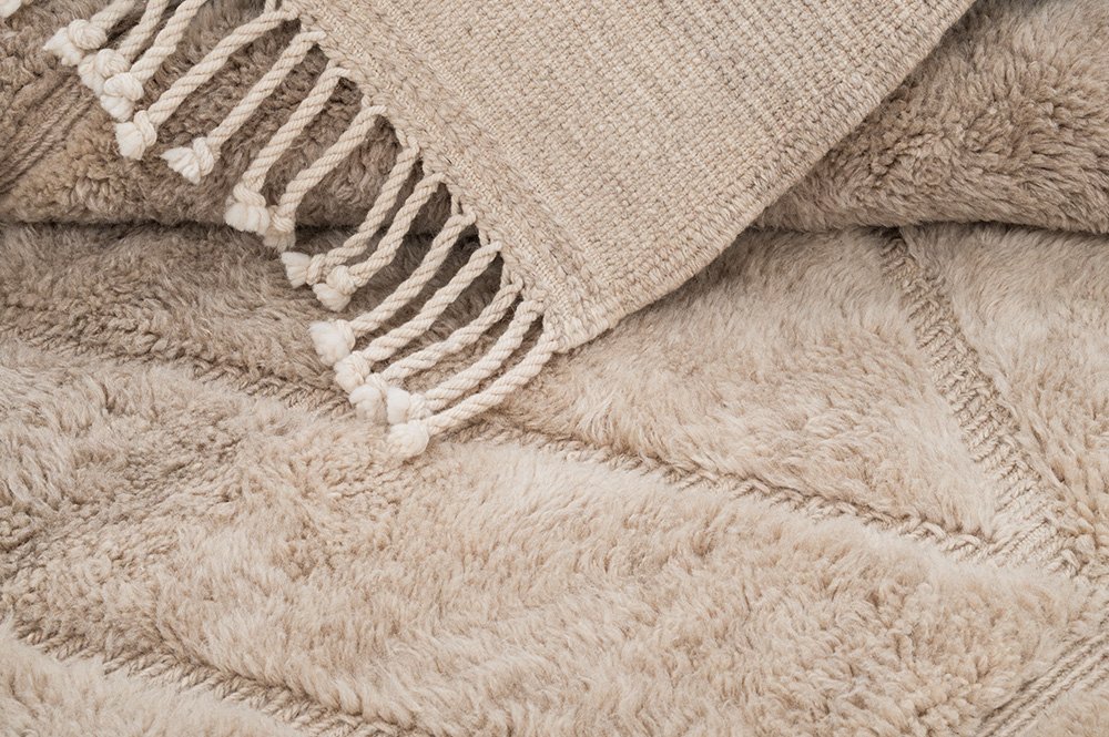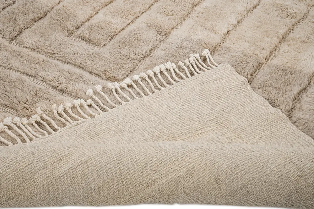A corner of the cream and green textured Moroccan rug is folded over, revealing a tassel.