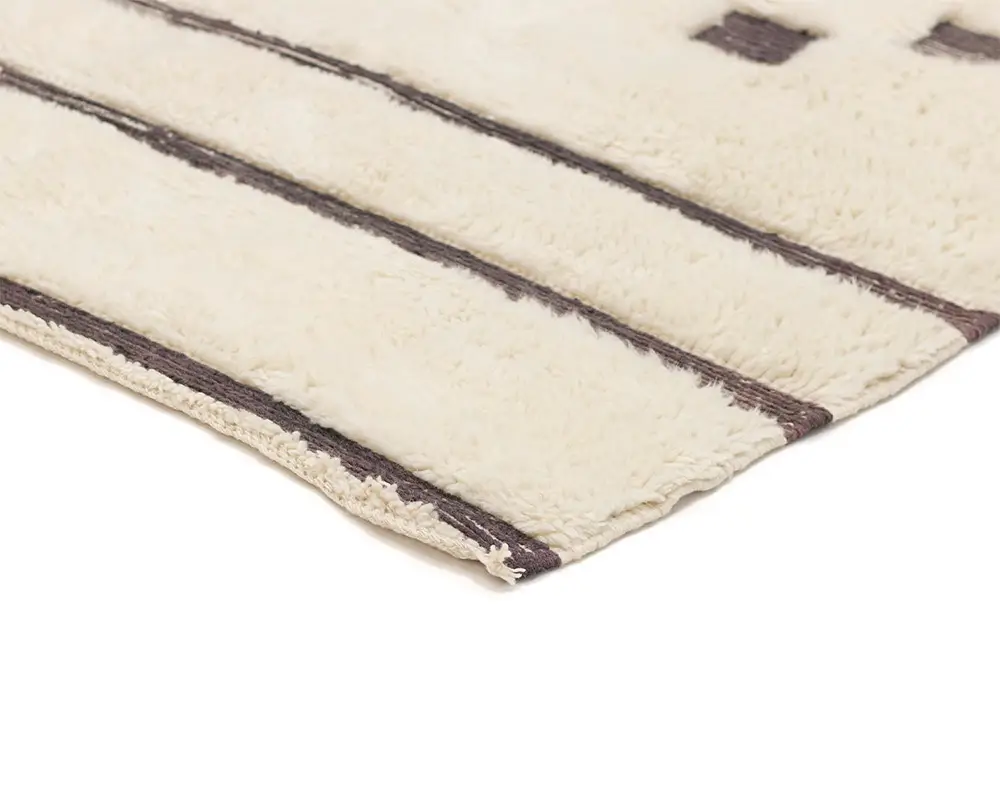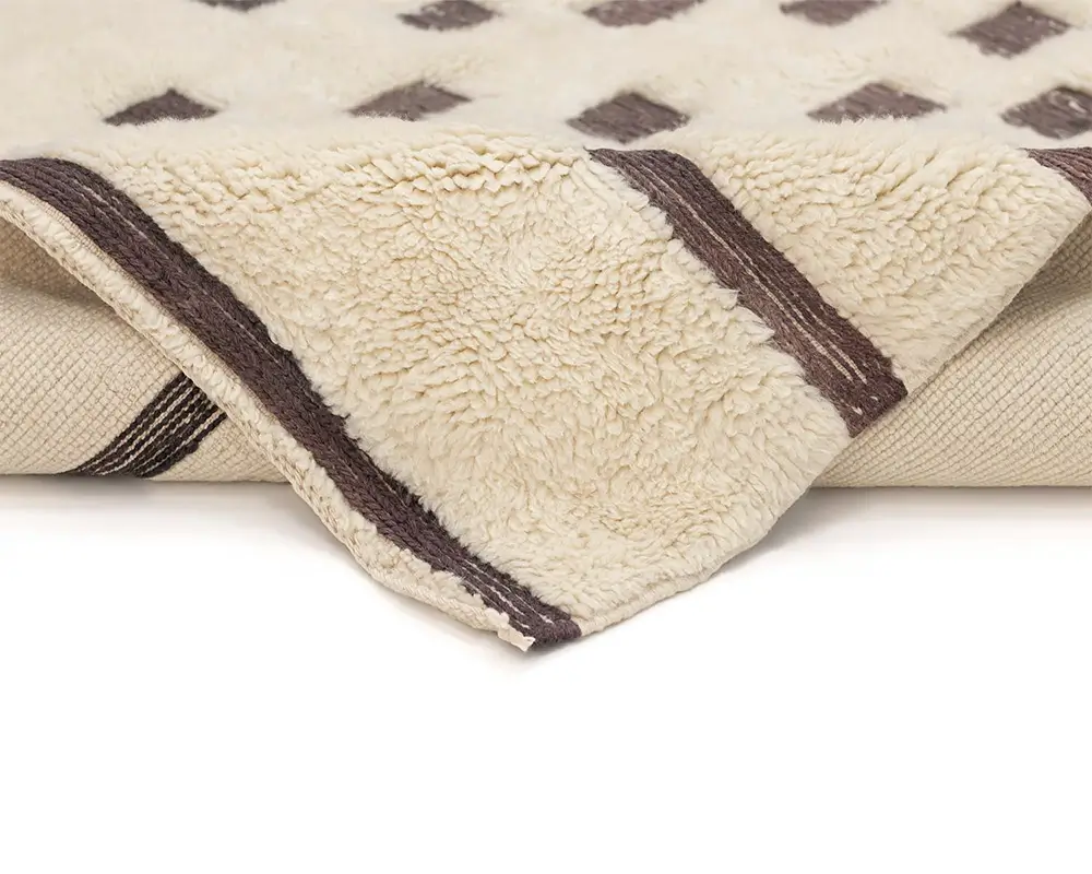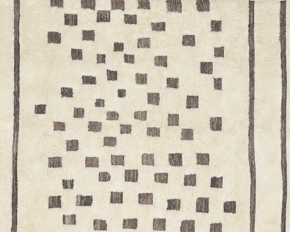Exquisite hand-knotted wool rug with a minimalist design, featuring handwoven scattered Chocolate Brown squares across an Ivory field, bordered by horizontal lines for a modern, sophisticated look.