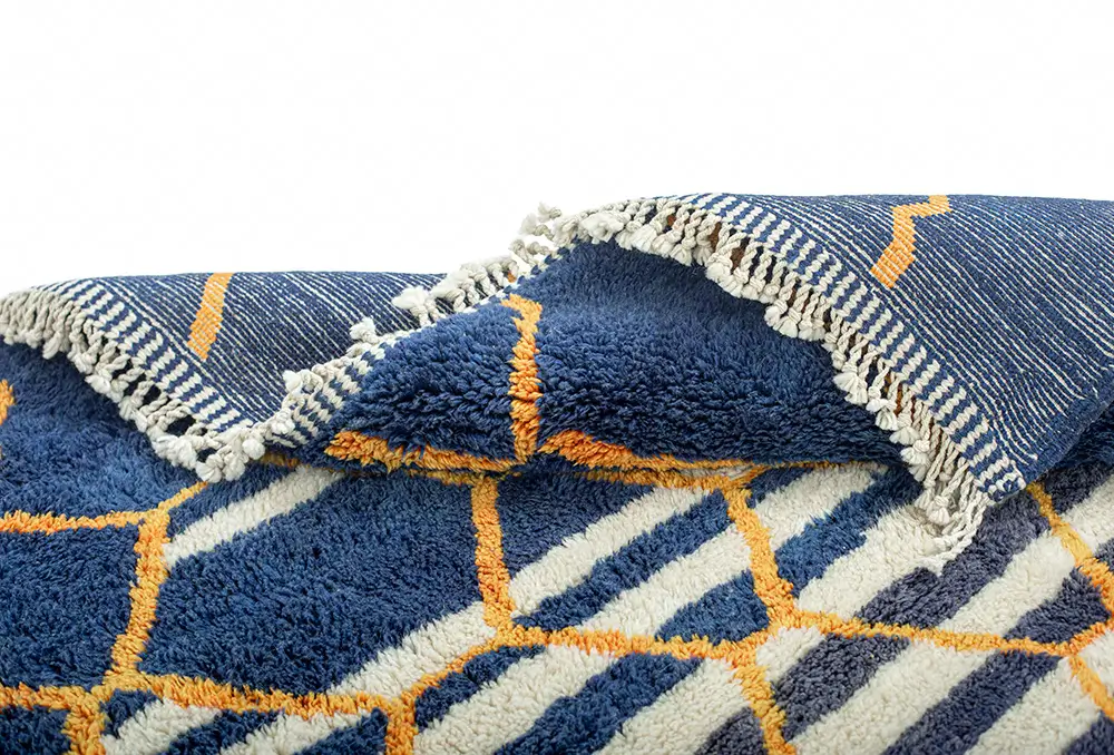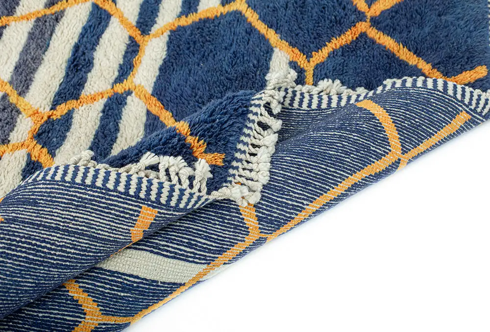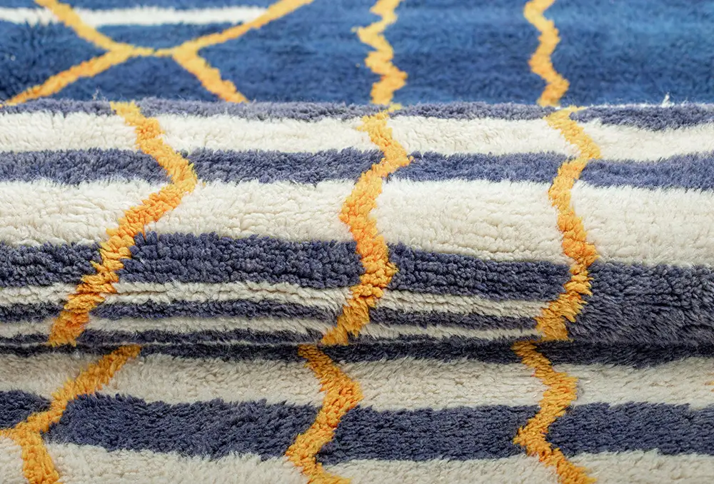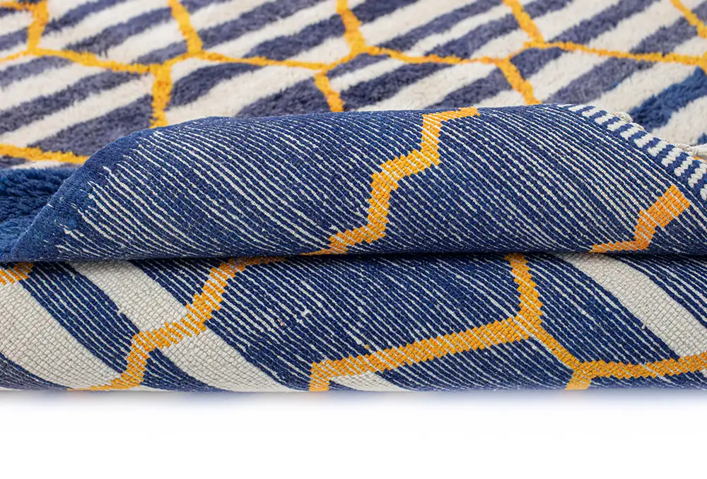 Abstract hand-knotted wool rug in deep Navy Blue and Ivory with vibrant Golden-yellow geometric and striped patterns. This bold, modern design brings energy and visual interest, making it a striking statement piece for any room.