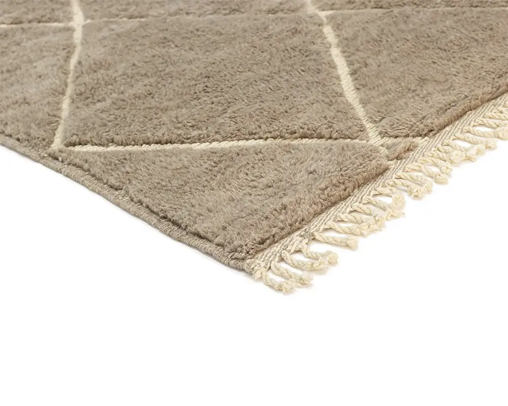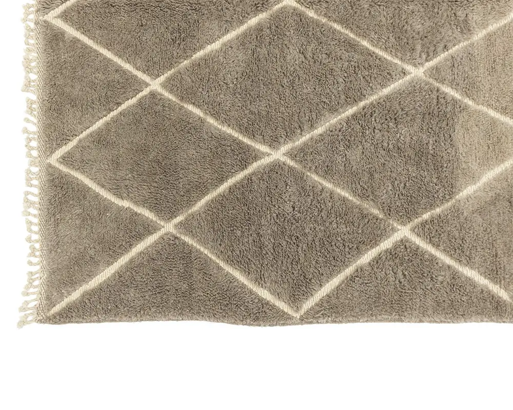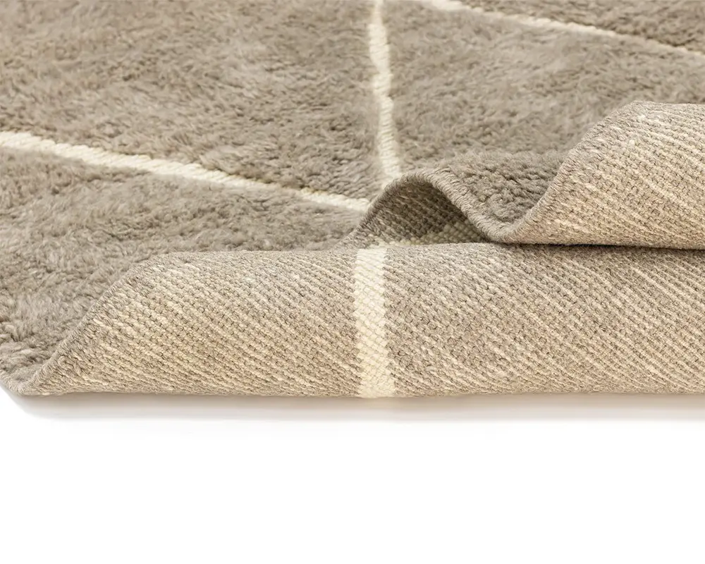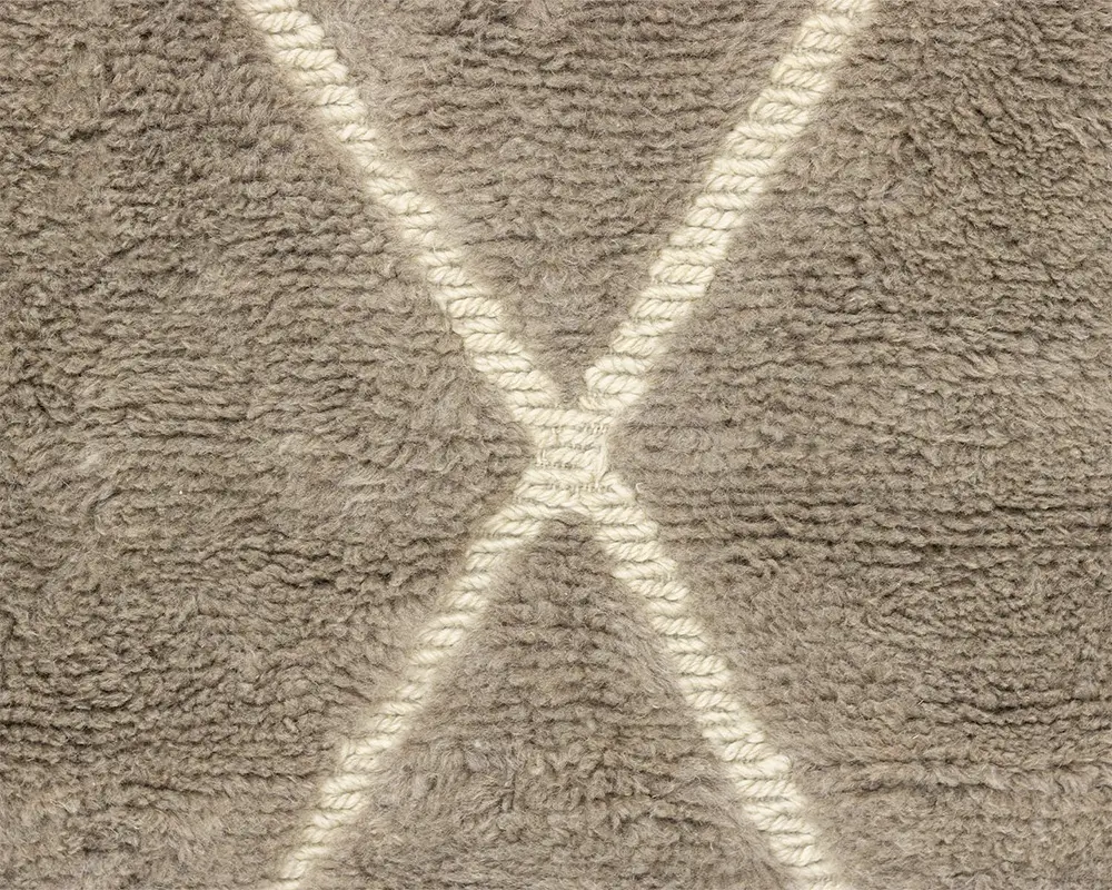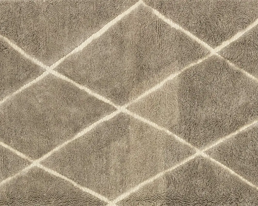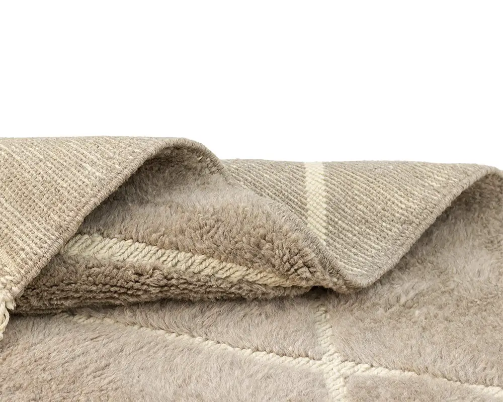 Luxurious hand-knotted and handwoven rug with a diamond pattern in a sophisticated Misty Taupe and Ivory palette, creating a plush and inviting texture perfect for any home setting.