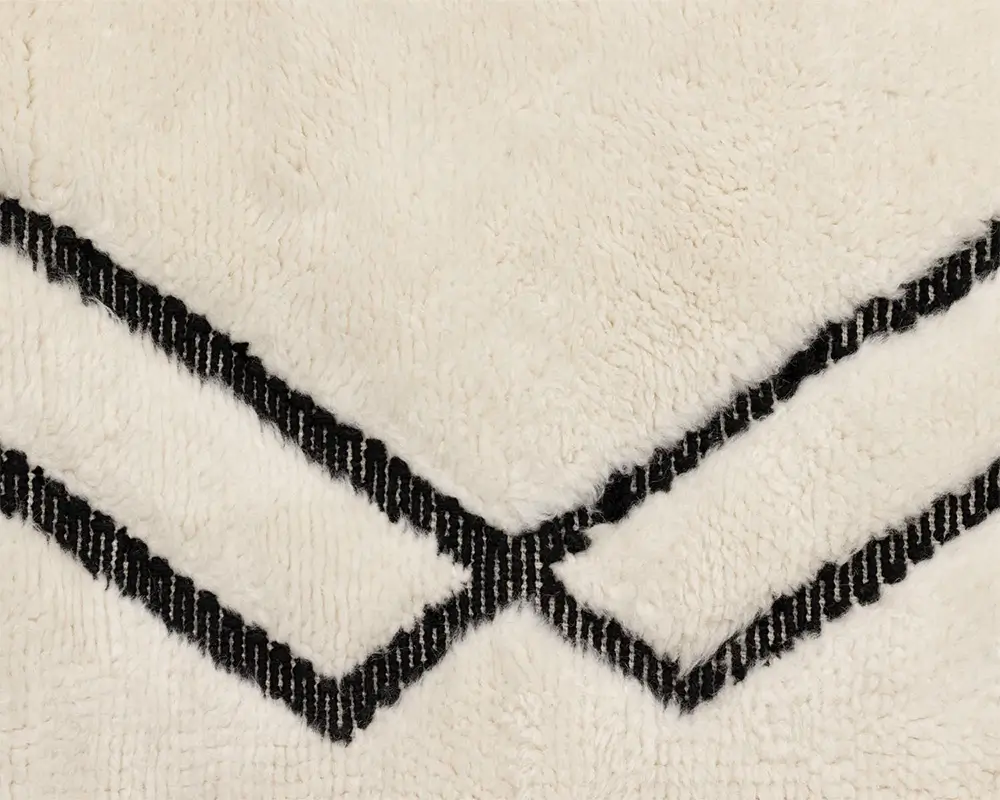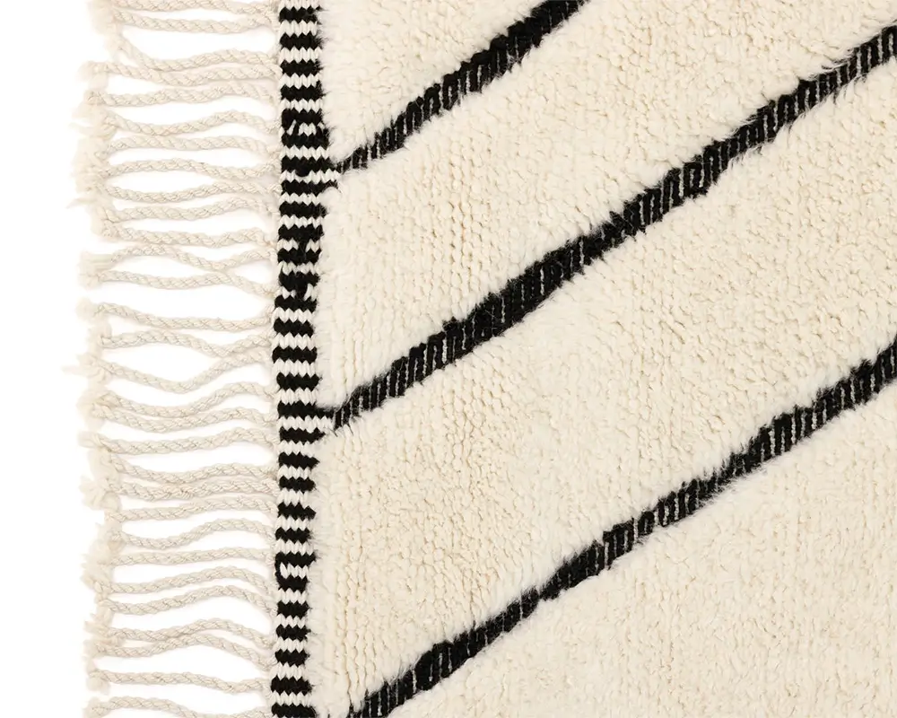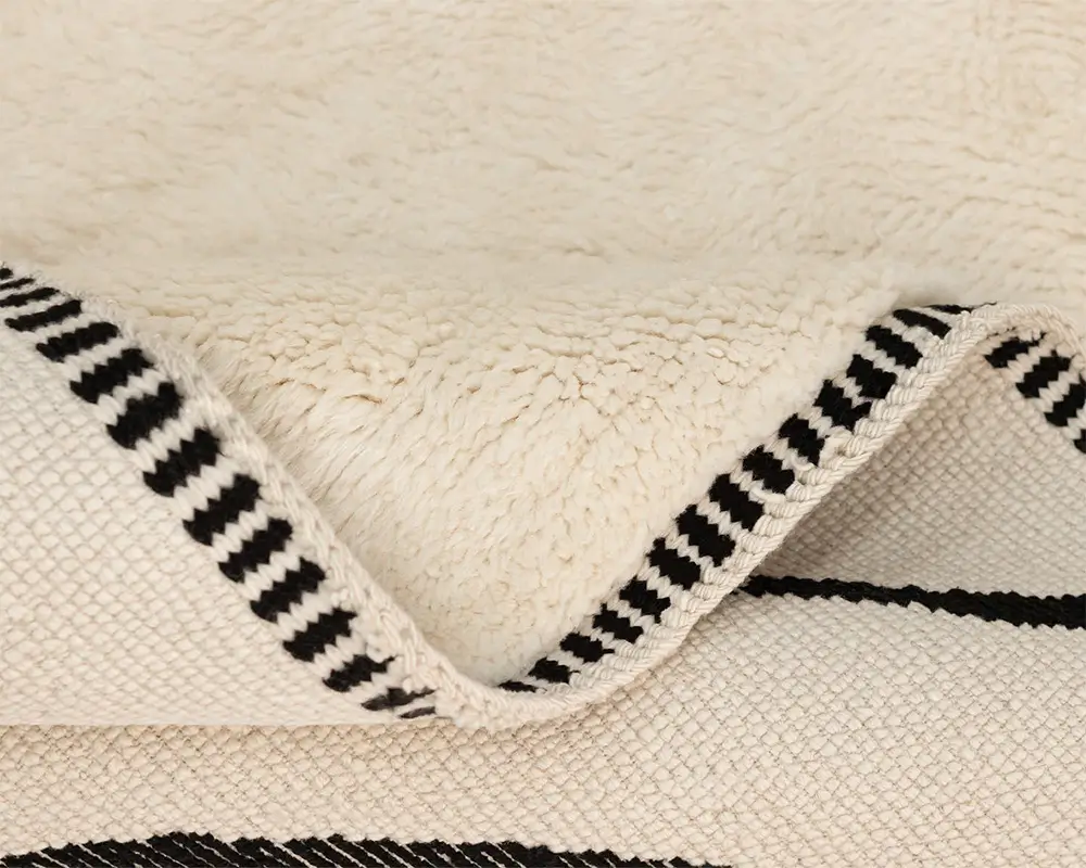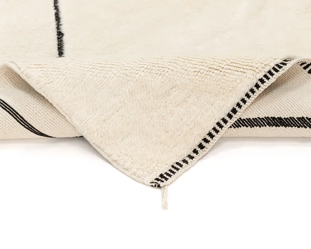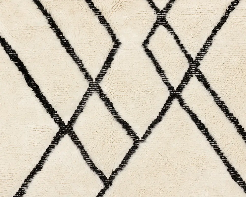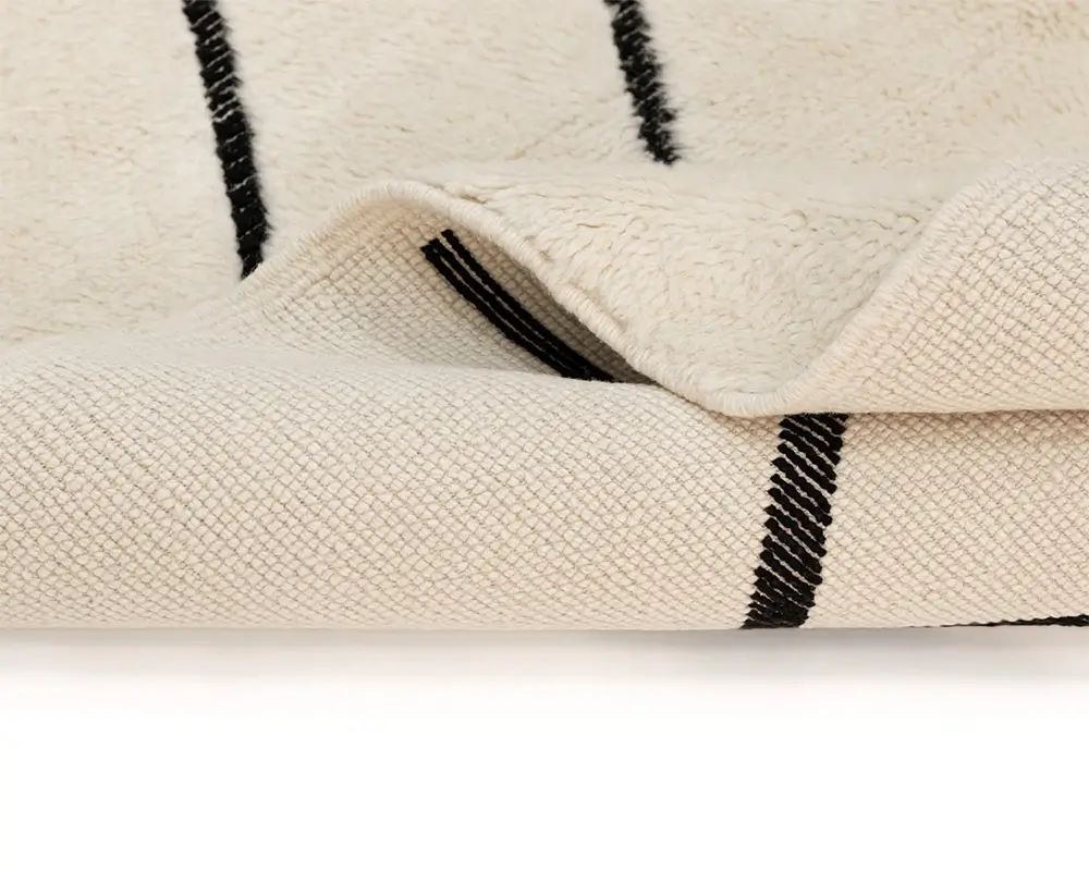 Sophisticated hand-knotted wool rug in Ivory, accented with a flat-woven geometric pattern of intersecting Midnight Black lines, perfect for contemporary and minimalist decors.