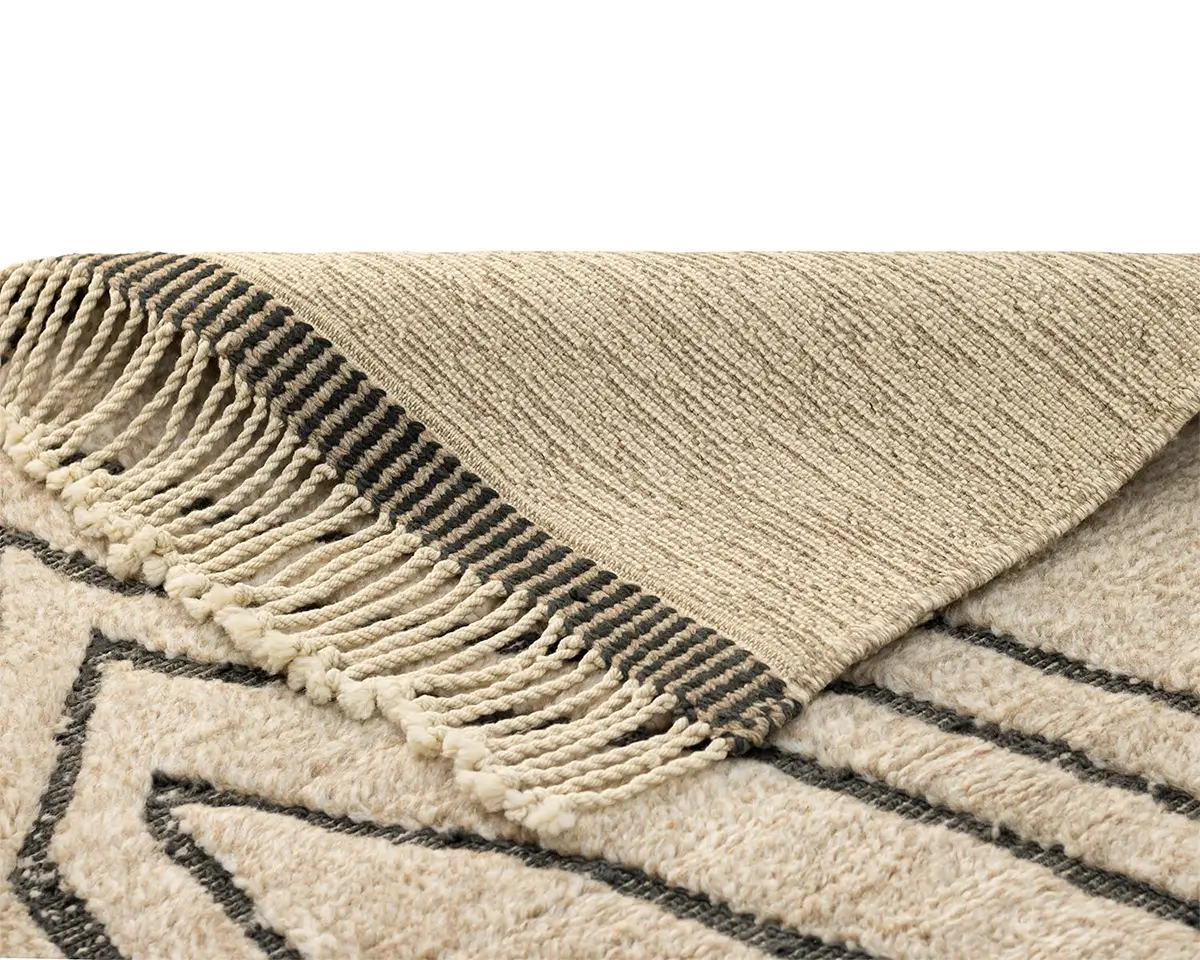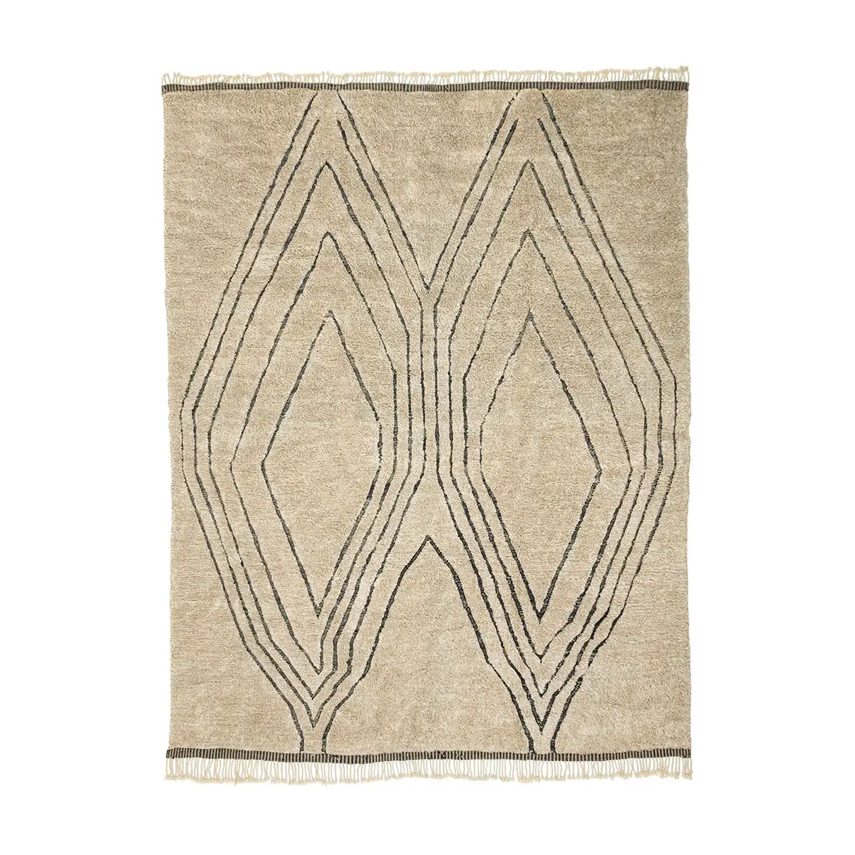 Captivating hand-knotted wool rug featuring a symmetrical diamond pattern in Fawn and Charcoal. Ideal to infuse any space with a luxurious and contemporary vibe.