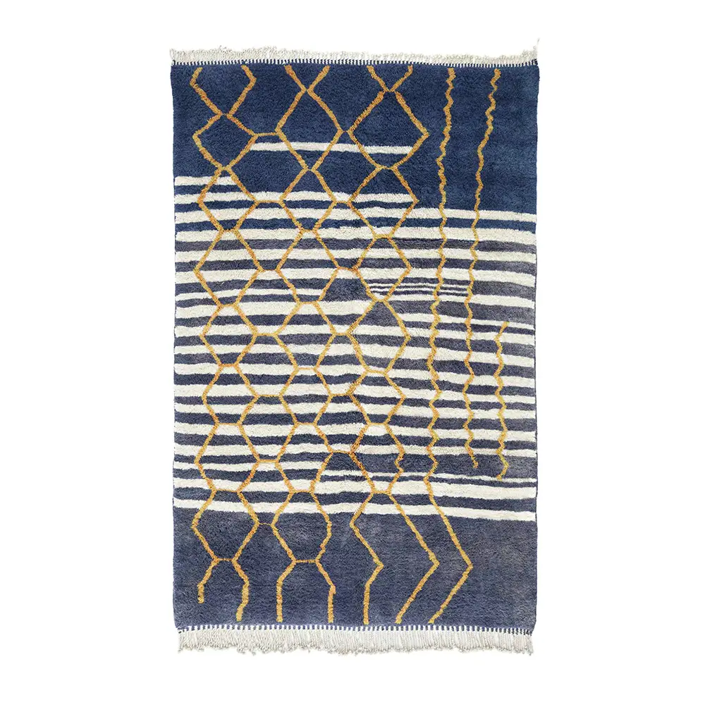 A close-up of a luxury rug showcases intricate hexagonal shapes in vibrant colors like yellow, blue, green, red, and brown against a light background. This hand-knotted masterpiece exemplifies the finest in handmade home decor.