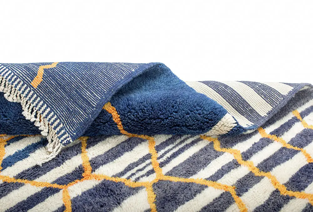 Close-up of a rolled, hand-knotted tapestry rug showcasing its intricate patterns on the surface and underside, embodying the essence of authentic Moroccan rugs.