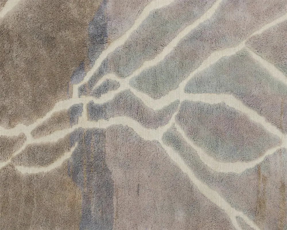 Striking hand-knotted wool rug displaying a harmonious blend of Dusk Rose, Misty Taupe, Lavender Blue, and Lavender Violet hues, overlaid with a hand-woven Ivory lightning pattern, creating a striking and contemporary aesthetic for any room.